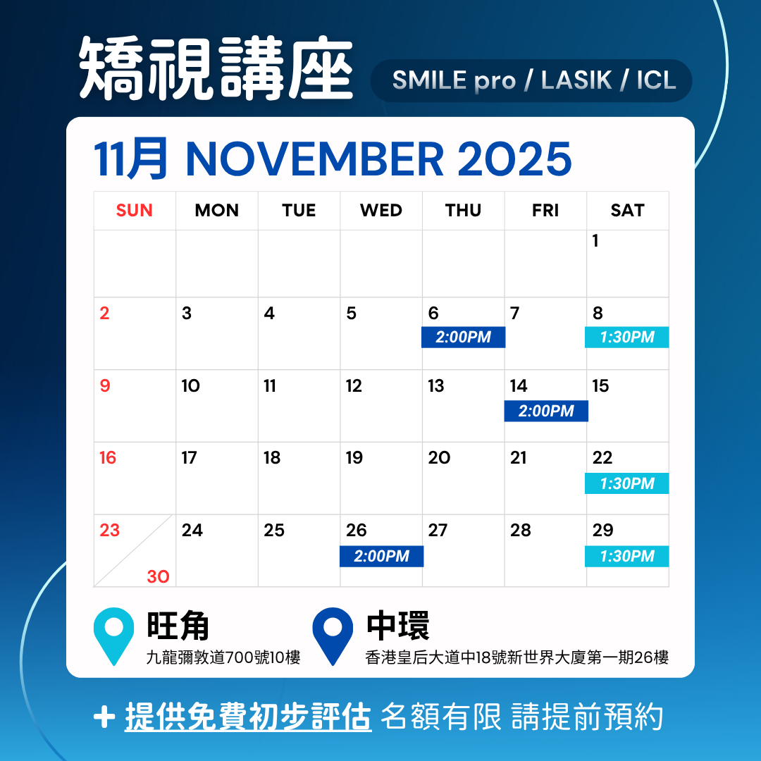 激光矯視講座 免費激光矯視講座(約1小時) 由眼科專科醫生主講,講解SMILE®pro、SMILE、LASIK及ICL的手術知識、手術流程、護理須知及諮詢問答。 當日設有基本驗眼服務,請預早15分鐘到達。 語言:中文 *講座有機會人數已滿,或因特別情況改期及取消,請留意Whatsapp信息與來電,由姑娘與您確認預約。 香港皇后大道中18號新世界大廈第一期26樓 九龍旺角彌敦道700號10樓 預約OA眼科手術中心矯視講座 姓名 年齡 年齡18-2526-3536-45 性別 性別 男 女 電子郵件 電話 留位人數 留位人數123456 選擇診所 選擇診所九龍香港 講座時間 - 九龍 講座時間 - 九龍04/10/2025 (Sat) 1:30 PM11/10/2025 (Sat) 1:30 PM18/10/2025 (Sat) 1:30 PM25/10/2025 (Sat) 1:30 PM08/11/2025 (Sat) 1:30 PM22/11/2025 (Sat) 1:30 PM29/11/2025 (Sat) 1:30 PM 講座時間 - 香港 講座時間 - 香港03/10/2025 (Fri) 2:00 PM08/10/2025 (Wed) 2:00 PM06/11/2025 (Thu) 2:00 PM14/11/2025 (Fri) 2:00 PM26/11/2025 (Wed) 2:00 PM 15 + 2 = 提交