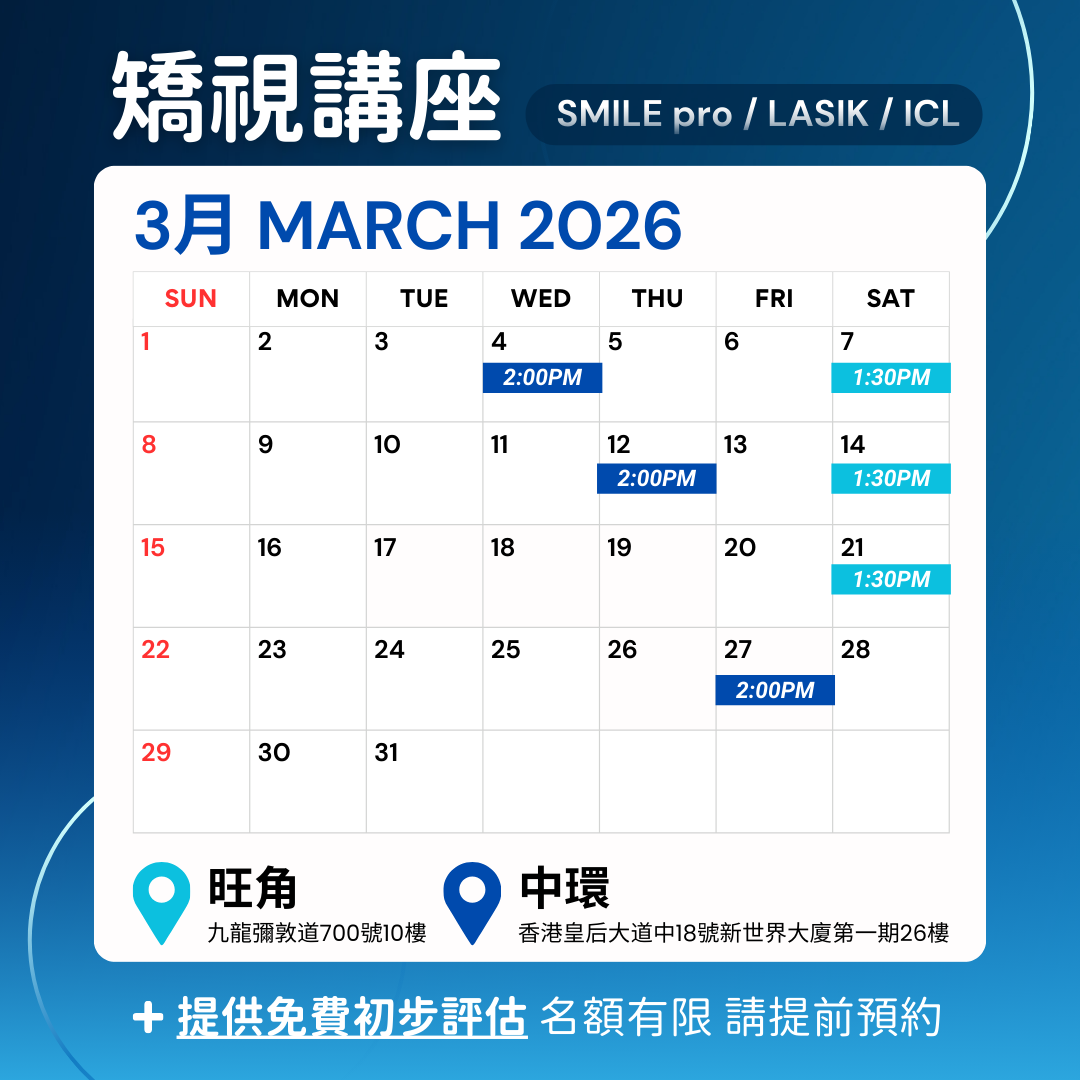 Conducted by a specialist ophthalmologist, the seminar will cover surgical knowledge, procedures, care instructions, and Q&A sessions on SMILE®pro, SMILE, LASIK, and ICL surgeries. Basic eye examination services will be available on the day. Please arrive 15 minutes early.